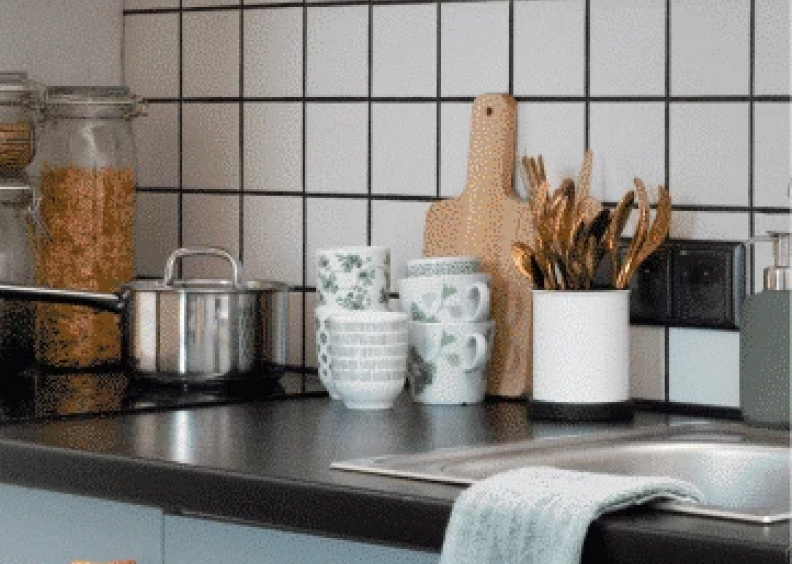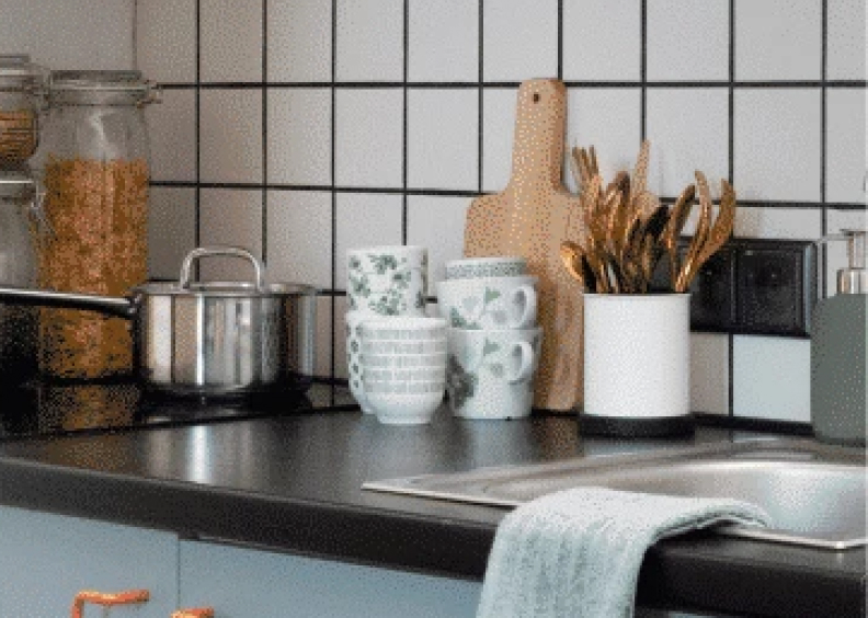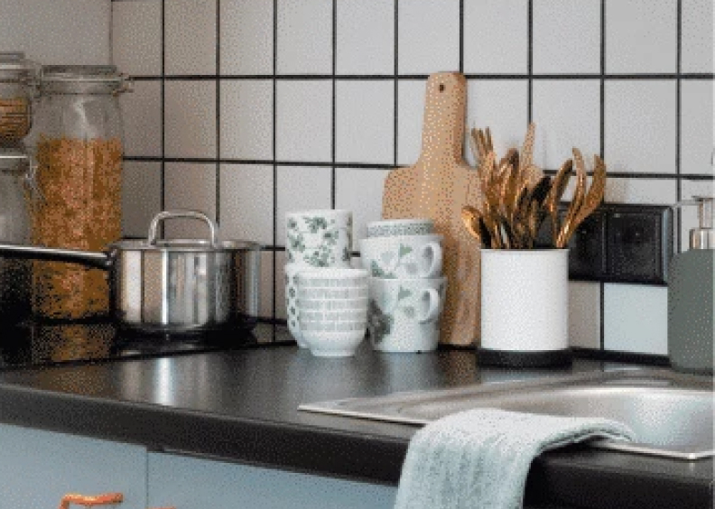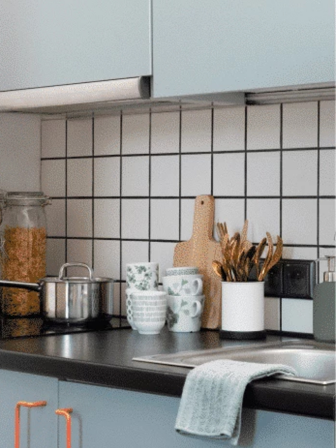The set includes a large frying pan, a broom and a dustpan, a set of knives 3 pcs, a large plate 4 pcs, a dish dryer, a drying tray, a cutting board, 4 glasses, 4 x 4 cutlery set, a cereal bowl 4 pcs, a small frying pan, a deep plate 4 pcs.